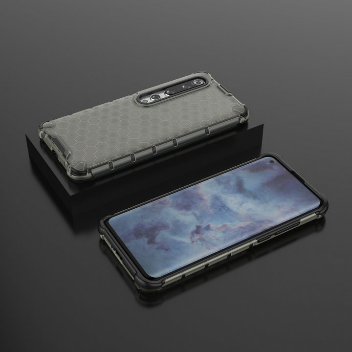 Чехол-накладка с рисунком в виде сот для смартфона Xiaomi Mi10 / Xiaomi Mi10 Pro, задняя панель из поликарбоната, рама из термополиуретана, сочетание жёсткости с гибкостью, дополнительная защита углов смартфона «воздушными подушками», накладка на кнопки регулировки громкости и включения / выключения, чёрный + прозрачный, чёрный + серый, чёрный + красный, чёрный + синий, чёрный + зелёный, Киев