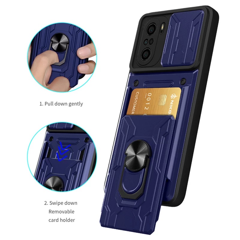 Характеристики чехла с защитной шторкой для камеры, магнитным кольцом и съёмным отделом для карт для Xiaomi Poco F3 / Xiaomi Redmi K40 / Xiaomi Redmi K40 Pro / Xiaomi Mi 11i: