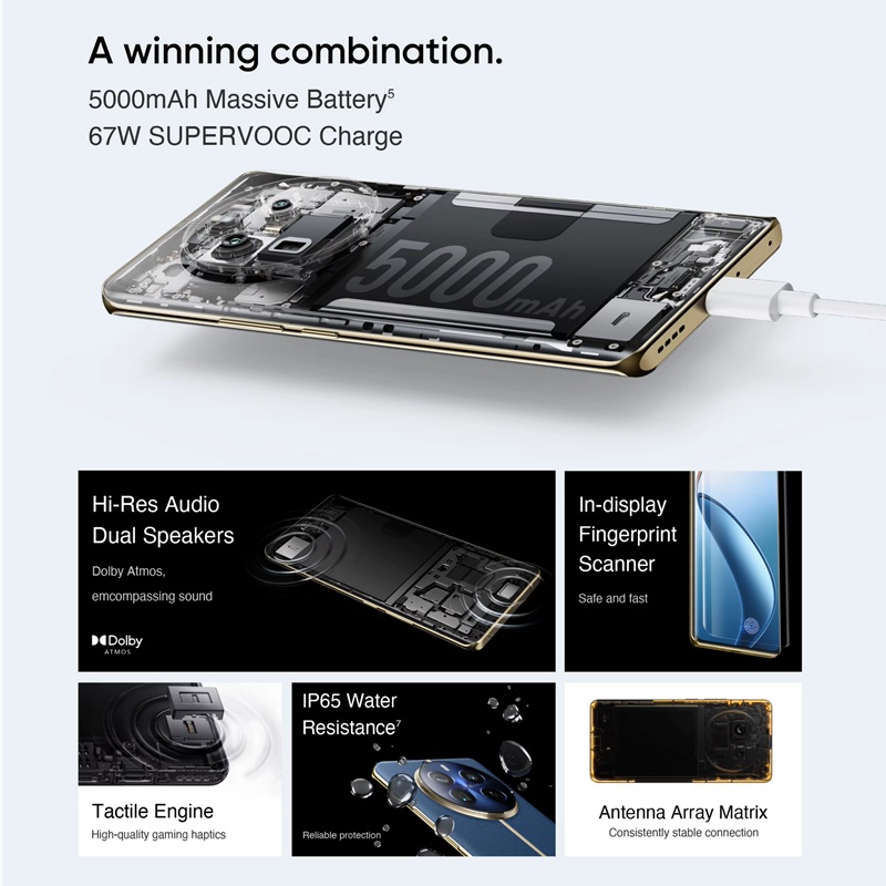 - акумулятор: 5000 мА/г, швидка зарядка SUPERVOOC 67 Вт (в комплекті зарядник на 67 Вт),