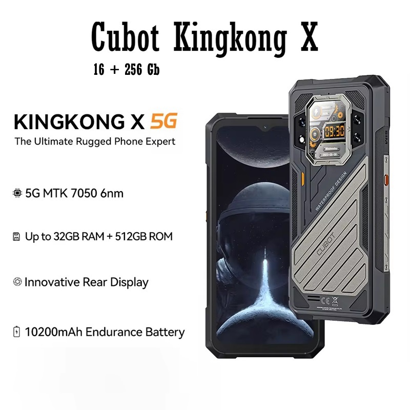 Захищений смартфон Cubot Kingkong X (16 + 256 Гб), захищений смартфон (IP68/IP69K, MIL-STD-810H), 2 SIM-карти, 4G LTE, 5G, Dimencity 7050, 16 Гб RAM + 256 Гб ROM, екран 6,58'' IPS 2408 * 1080, 120 Гц, другий екран на задній панелі 1,85'', 2 основні камери 100 МП + 5 МП, селфі камера 32 МП, акумулятор 10200 мА/г, 33 Вт, сканер відбитків пальців, Wi-Fi, Bluetooth 5.1, GPS, NFC / Google Pay, OTG, USB Type-C, Android 14, УКРАЇНСЬКА МОВА, GOOGLE PLAY, Київ, Киев